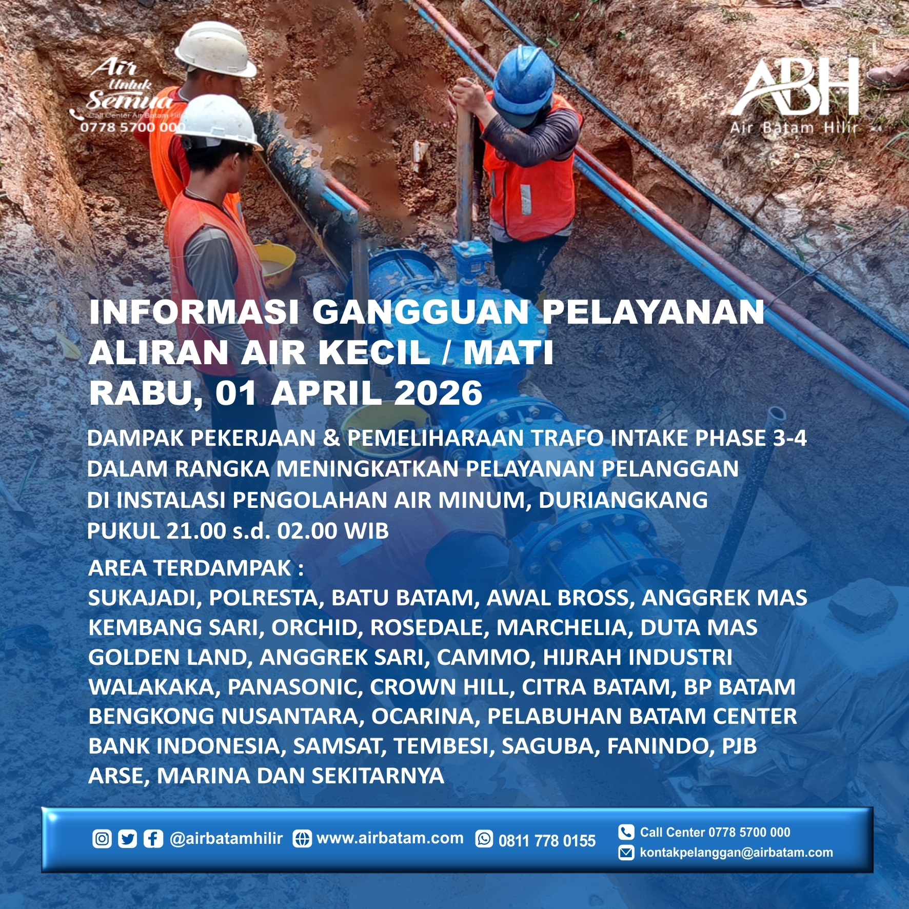 Air Batam Hilir menginformasikan, pelaksanaan Pekerjaan dan Pemeliharaan Trafo Intake Phase 3-4 di Instalasi Pengolahan Air Minum Duriangkang dan akan dilakukan pada :