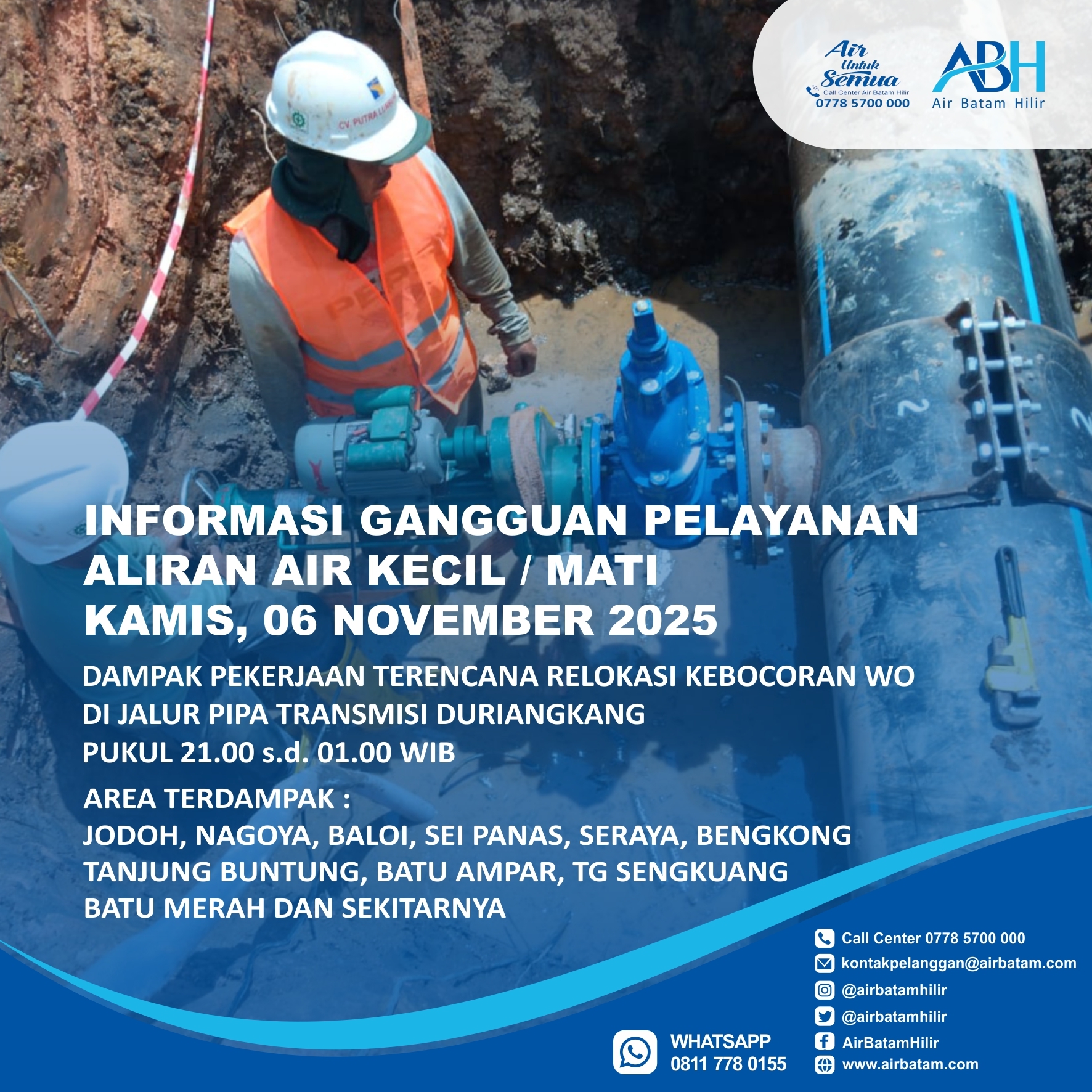 Air Batam Hilir menginformasikan, pelaksanaan pekerjaan terencana Relokasi Kebocoran WO di Jalur Pipa Transmisi Duriangkang DN Steel 800mm dan akan dilakukan pada :