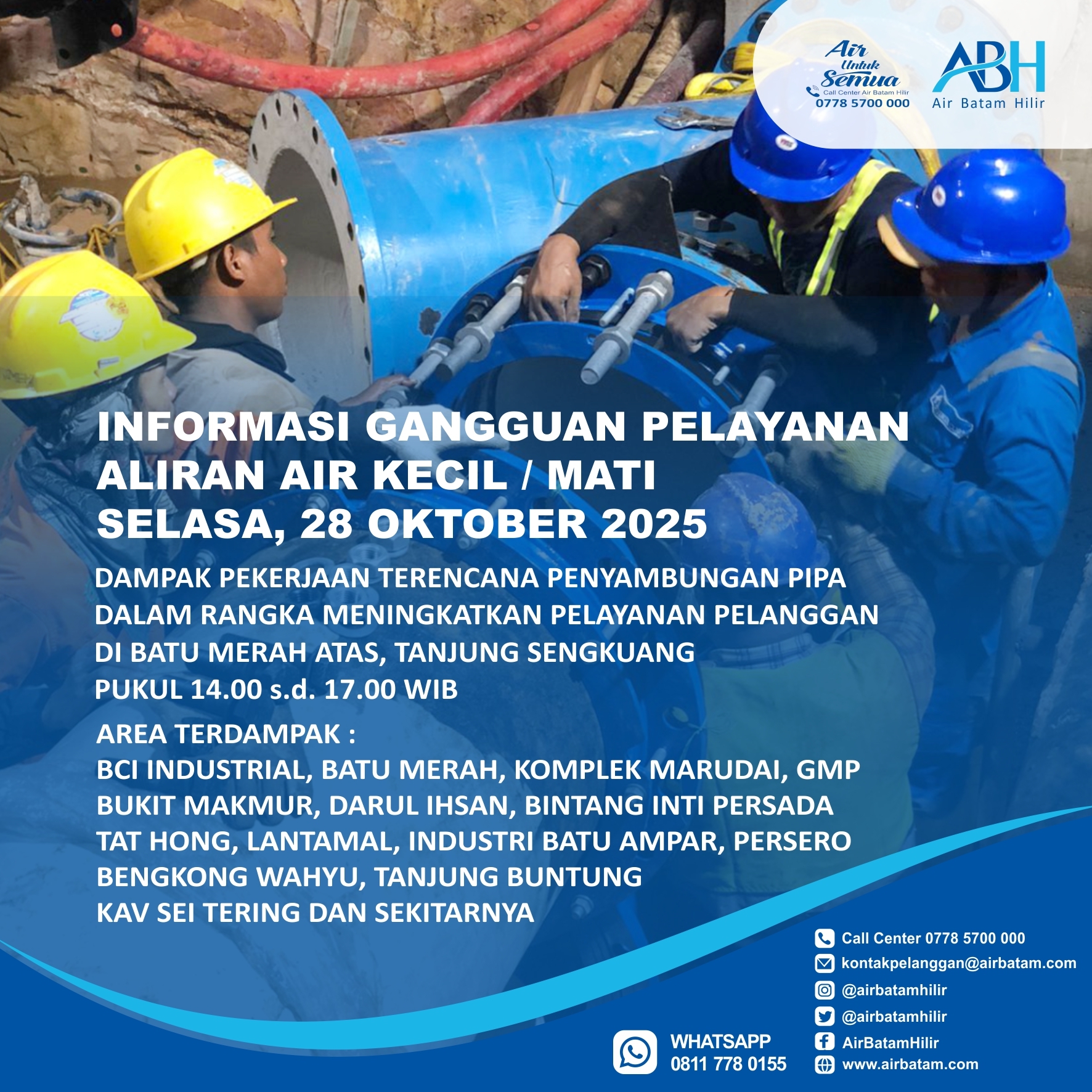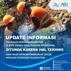Air Batam Hilir menginformasikan, pelaksanaan pekerjaan terencana Penyambungan Pipa 225mm di Batu Merah Atas, Tanjung Sengkuang yang bertujuan untuk meningkatkan suplai pelanggan dan akan dilakukan pada :