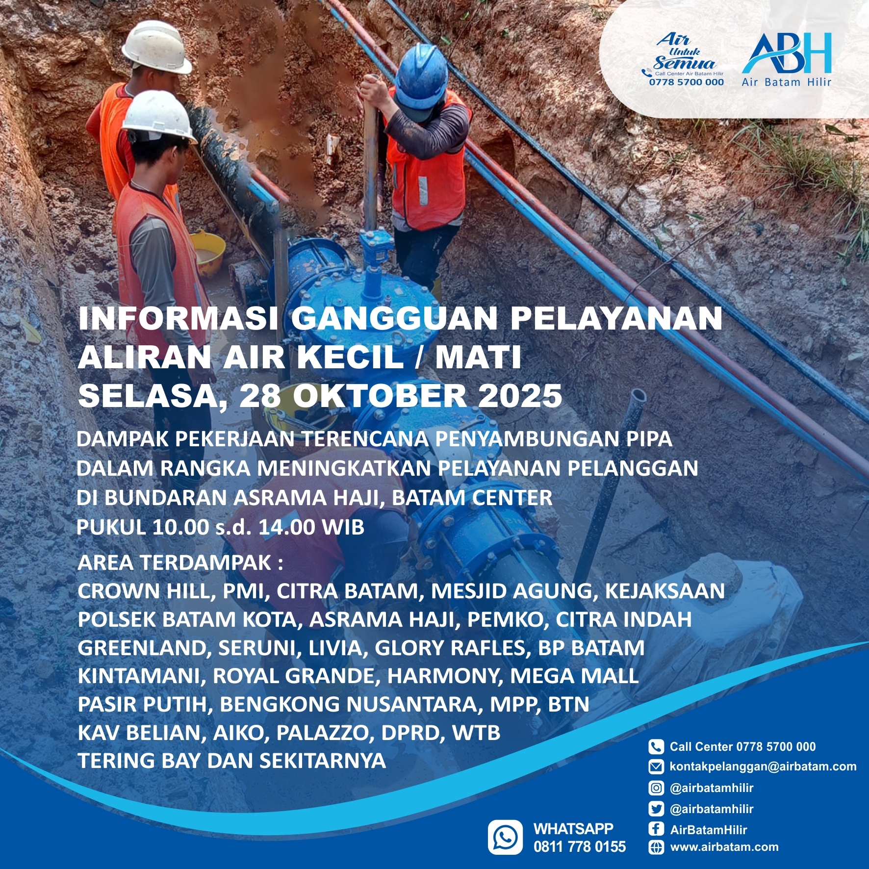 Air Batam Hilir menginformasikan, pelaksanaan pekerjaan terencana Penyambungan Pipa 100mm di Bundaran Asrama Haji, Batam Center yang bertujuan untuk meningkatkan suplai pelanggan dan akan dilakukan pada :