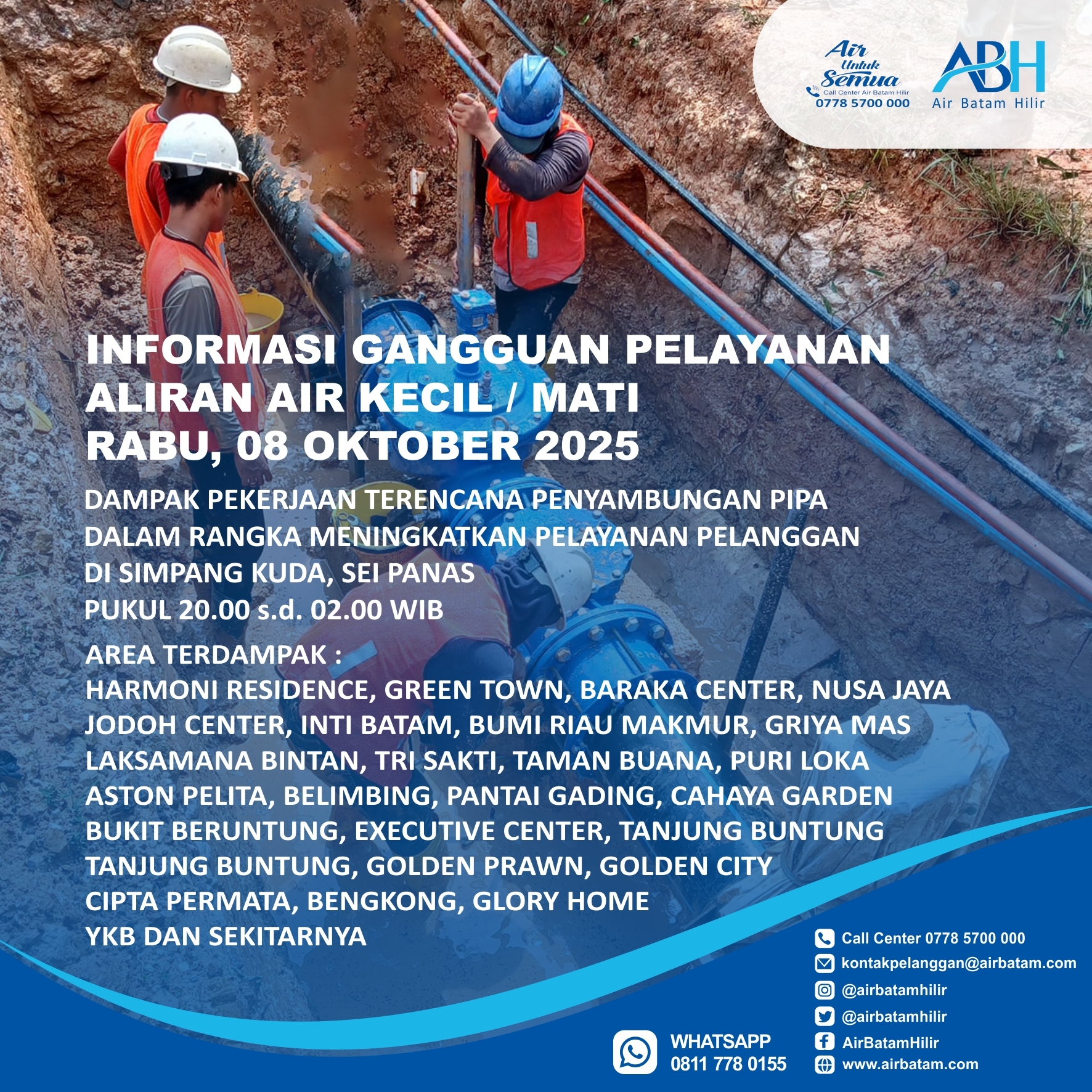 Area terdampak : Harmoni Residence, Bengkong Jaya, Bengkong Center, Bengkong Mahkota, Bengkong Permai, Bengkong City, Bengkong Dalam, Bengkong Palapa, Bengkong Ratu, Bengkong Harapan 1 & 2, Bengkong Kodim, Bengkong Mas, Bengkong Aljabar, Green Town, Baraka Center, Jodoh Center, Inti Batam, Laksamana Bintan, Bumi Riau Makmur, Tanjung Trisakti, Taman Buana, Aston Pelita, Belimbing, Puriloka, Bukit Beruntung, Griya Mas, Nusa Jaya, Eecutive Center, Bengkong Indah 1 & 2, Bengkong Baru, Bengkong Swadebi, Sadai, YKB, Tanjung Buntung, Golden Prawn, Golden City, Pantai Gading, Cahaya Garden, Glory Home, Cipta Permata dan Sekitarnya.
