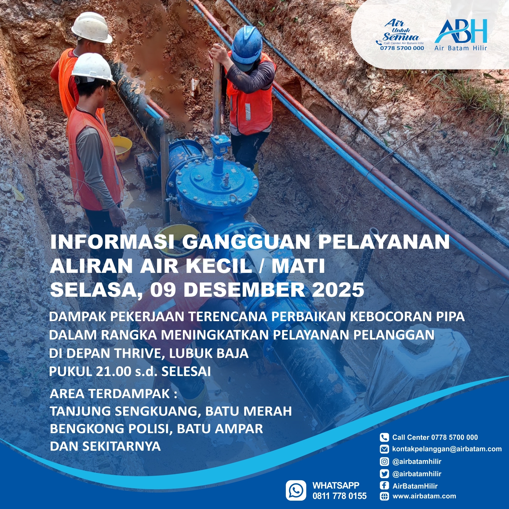 Air Batam Hilir menginformasikan, pelaksanaan pekerjaan terencana Perbaikan Kebocoran Pipa Steel 400mm di Depan Thrive, Lubuk Baja dan akan dilakukan pada :