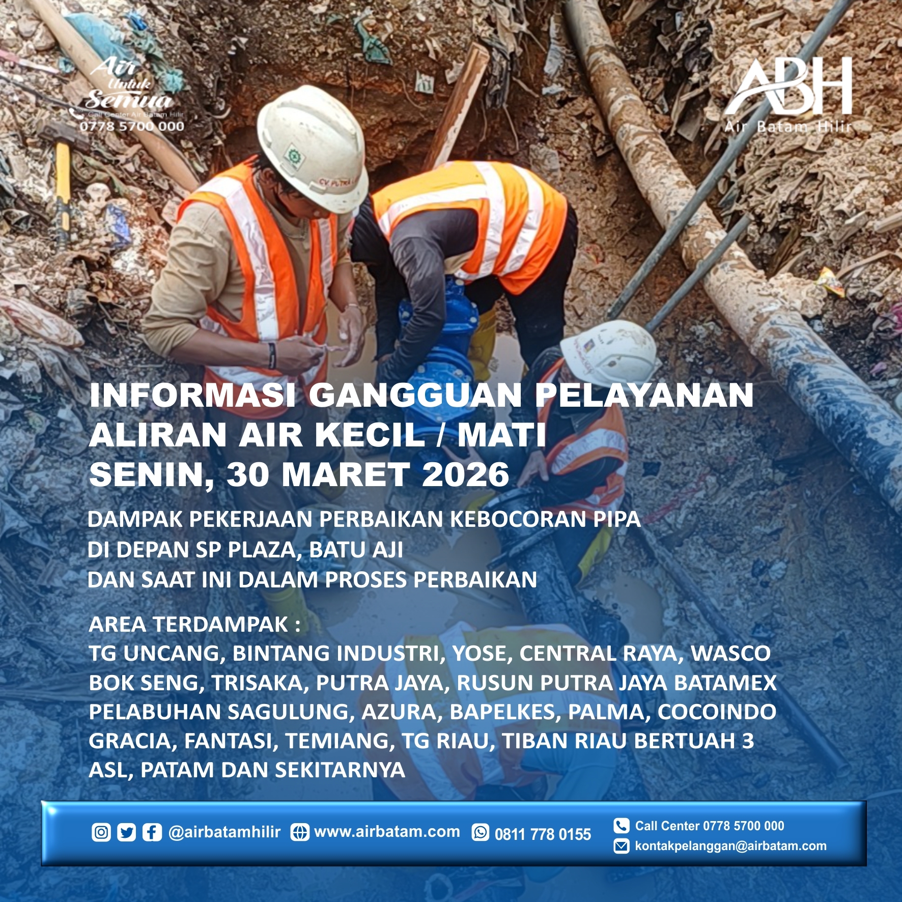 Air Batam Hilir menginformasikan, dampak pekerjaan perbaikan kebocoran pipa di Depan SP Plaza, Batu Aji dan saat ini dalam proses perbaikan.