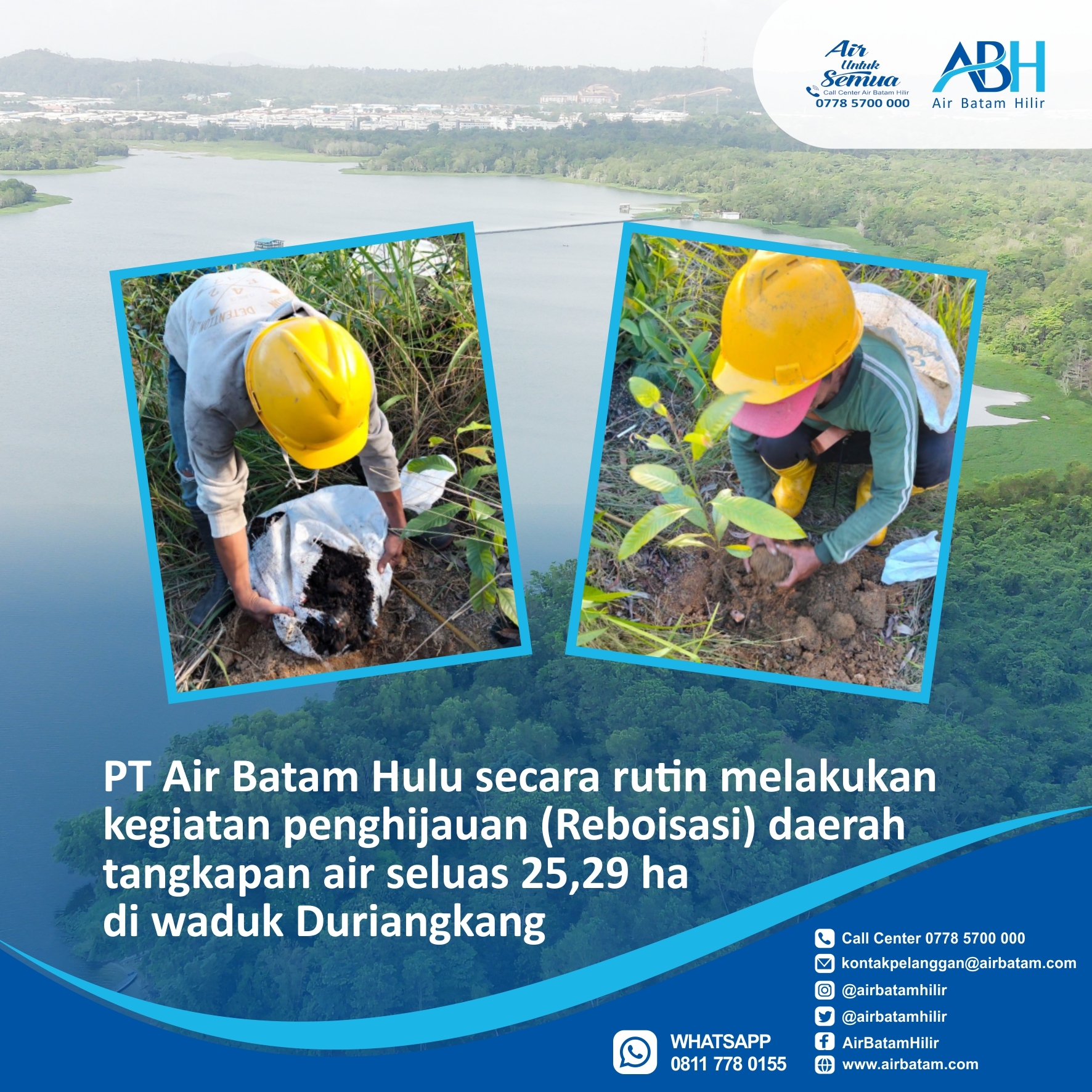 PT Air Batam Hulu (ABHu) secara rutin melakukan kegiatan penghijauan (Reboisasi) daerah tangkapan air di waduk duriangkang dengan luas area mencapai 25,29 ha selama periode 2025. sebagai komitmen dalam menjaga ketersediaan serta kualitas sumber air baku.