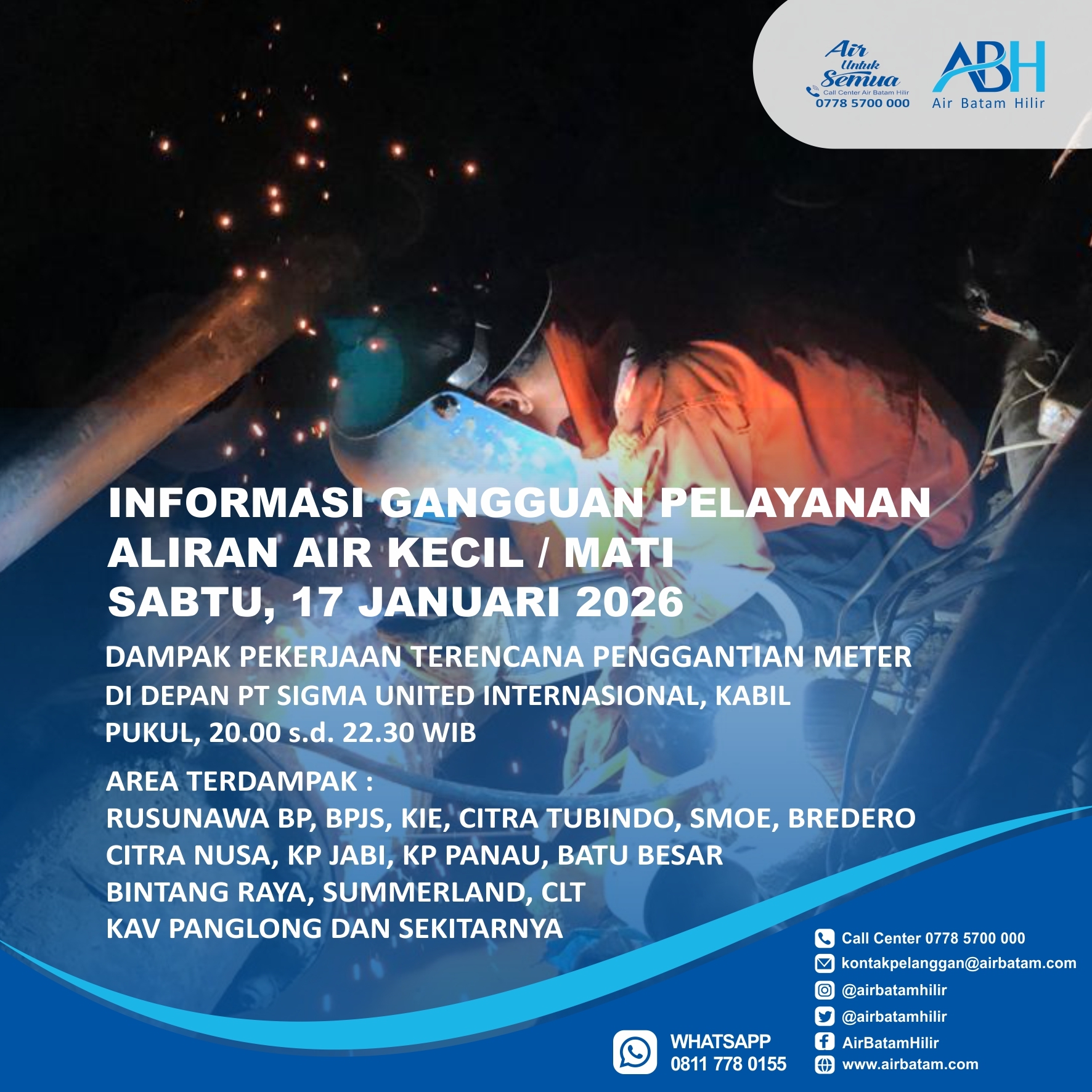 Pelanggan Air Batam Hilir, Air Batam Hilir menginformasikan, dampak pekerjaan Penggantian Meter di PT Sigma United Internasional, Kabil dan akan dilakukan pada : Sabtu, 17 Januari 2026 Pukul, 20.00 s.d. 22.30 WIB Selama pekerjaan ini, akan berdampak pada gangguan pelayana