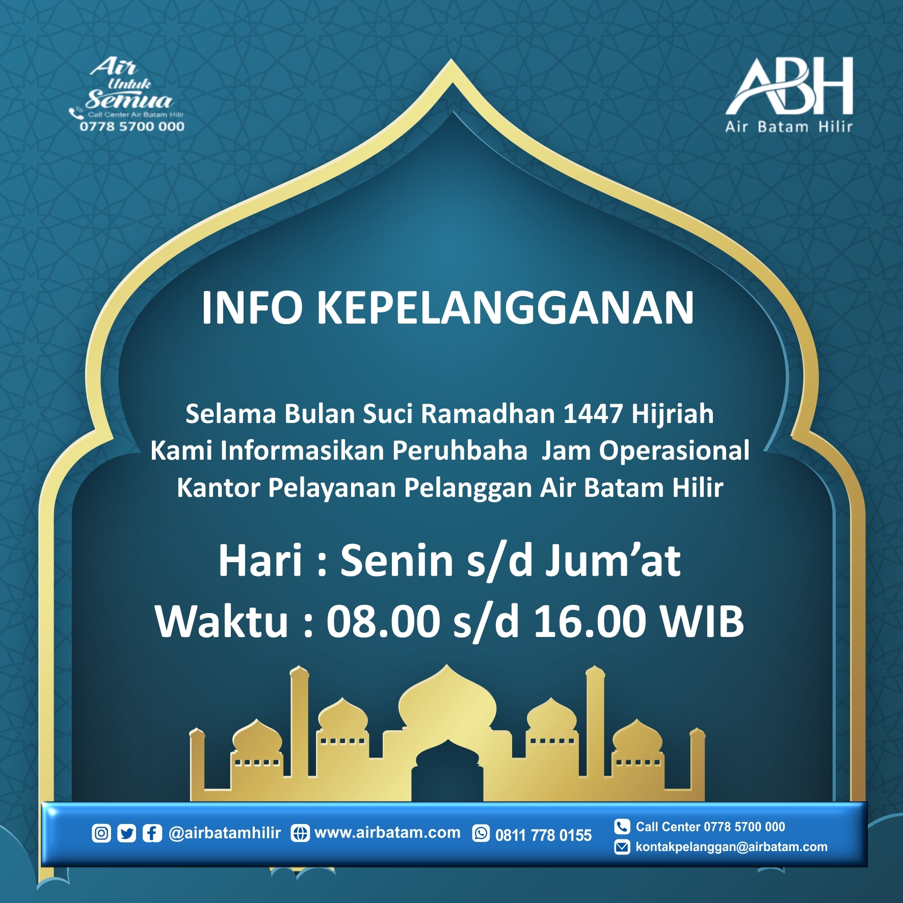 Pelanggan Air Batam Hilir, INFORMASI KEPELANGGANAN Selama Bulan Suci Ramadhan 1447 H/2026, kami informasikan perubahan jam operasional kantor Pelayanan Pelanggan Air Batam Hilir. Hari : Senin s/d Jumat Waktu : 08.00 s/d 16.00 WIB Layanan Call Center Air Batam Hil