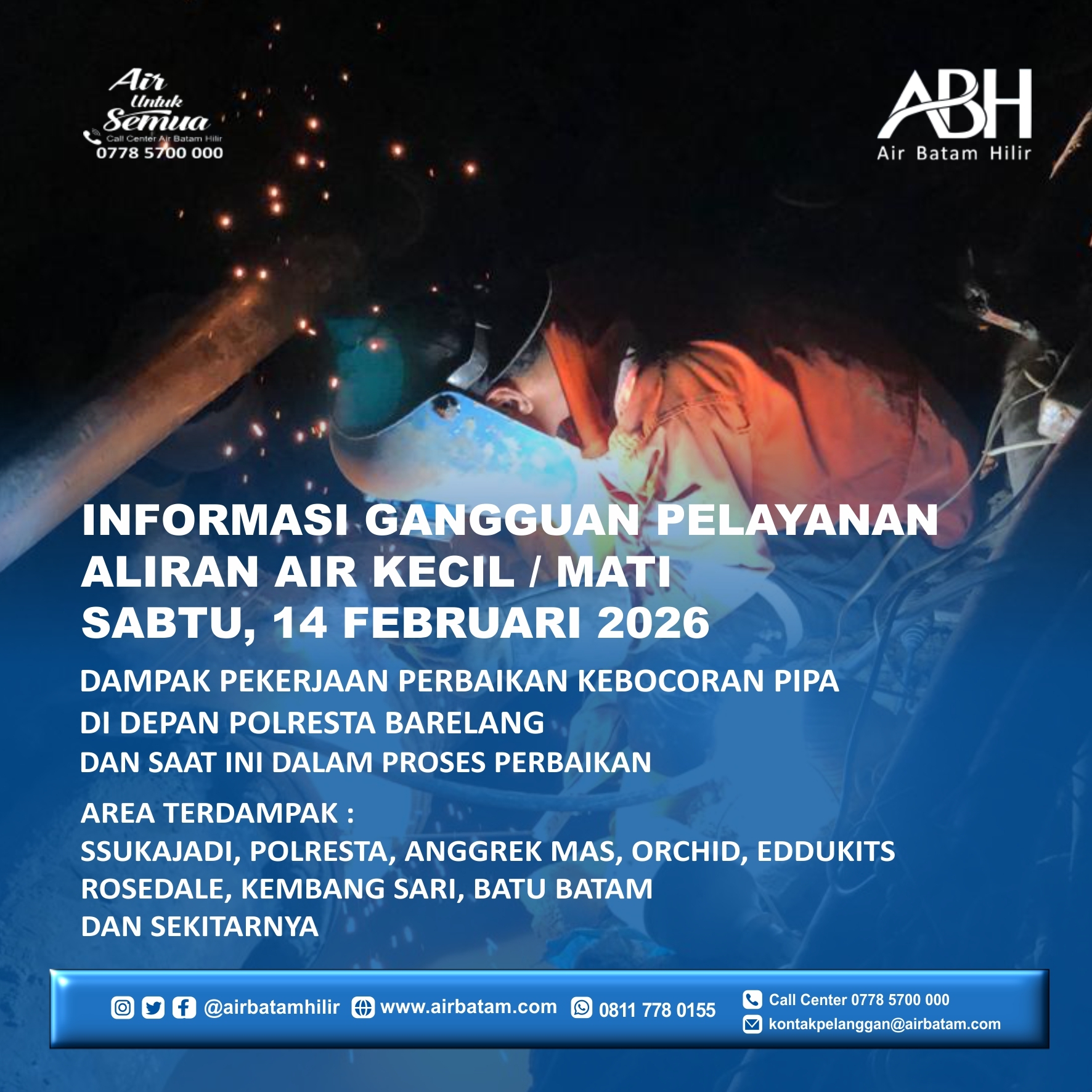 Pelanggan Air Batam Hilir, Air Batam Hilir menginformasikan, dampak pekerjaan perbaikan kebocoran pipa DN 400mm di Depan Polresta Barelang dan saat ini dalam proses perbaikan. Selama pekerjaan ini, akan berdampak pada gangguan pelayanan suplai air minum berupa air kecil dan air terhenti untuk seme