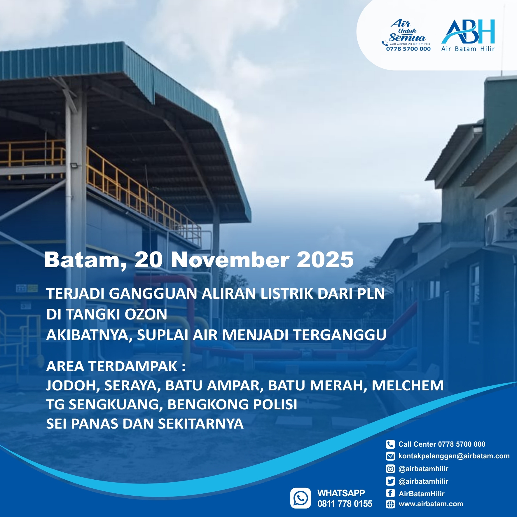 Pelanggan Air Batam Hilir, Air Batam Hilir menginformasikan, dampak gangguan aliran listrik dari PLN di Tangki Ozon. Kamis, 20 November 2025 Hal ini berdampak pada gangguan pelayanan suplai air minum berupa air kecil dan air terhenti untuk sementara waktu. Area terdampak : Jodoh, Seraya, Batu Am