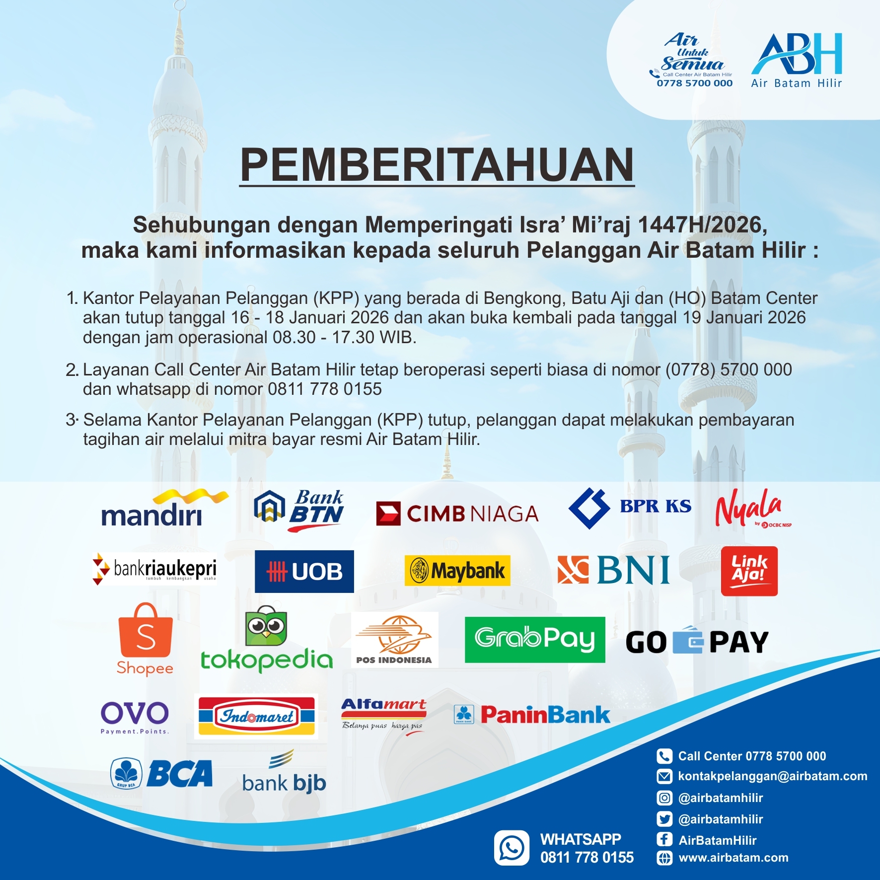 Pelanggan Air Batam Hilir, Memperingati Isra Mi’raj Nabi Muhammad SAW 1447H/2026 Maka kami informasikan : Kantor Pelayanan Pelanggan (KPP) yang berada di Bengkong, Batu Aji dan (HO) Batam Center akan tutup tanggal 16 - 18 Januari 2026 dan akan buka kembali pada tanggal 19 Januari