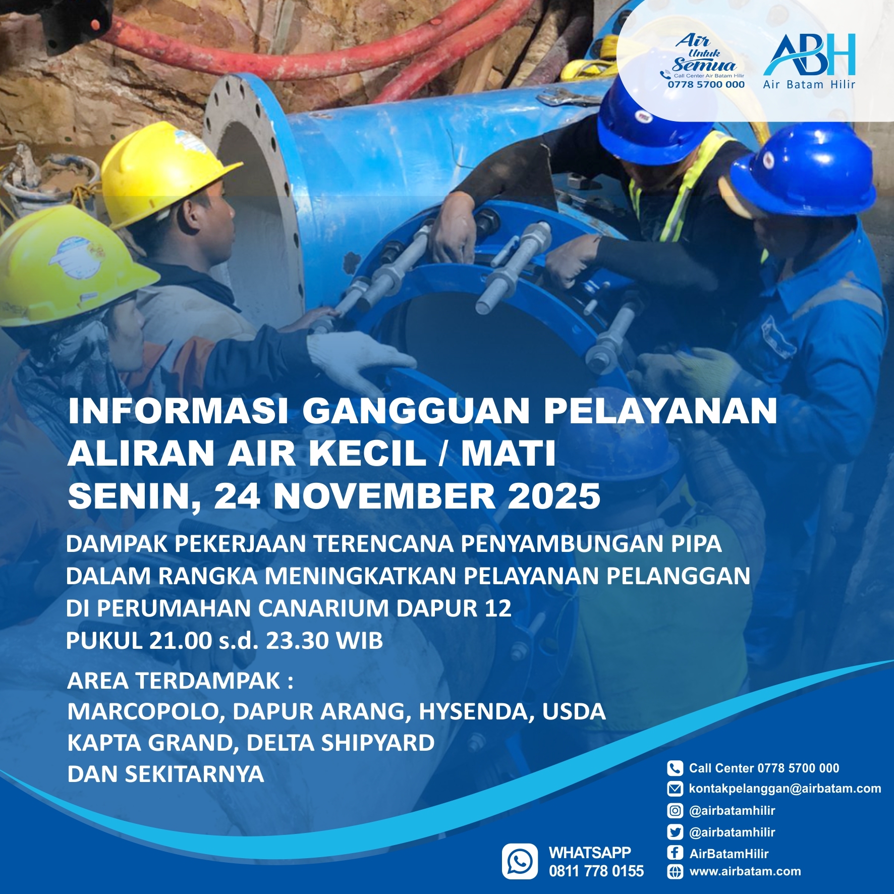 Pelanggan Air Batam Hilir, Air Batam Hilir menginformasikan, pelaksanaan pekerjaan terencana Penyambungan Pipa HDPE 160mm di Perumahan Canarium, Dapur 12 dan akan dilakukan pada : Senin, 24 November 2025 Pukul, 21.00 s.d. 23.30 WIB Selama pekerjaan ini, akan berdampak pada gangguan pelayanan supl