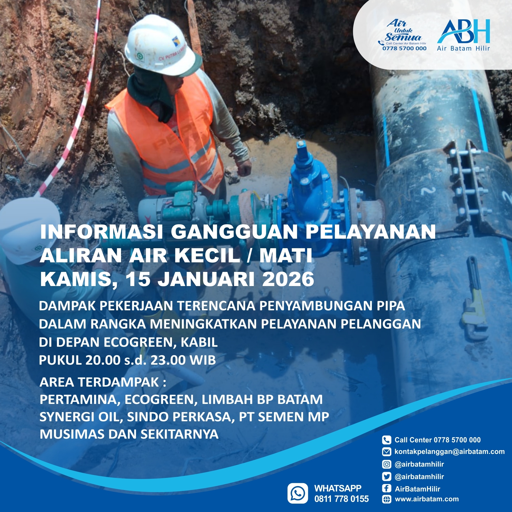Pelanggan Air Batam Hilir, Air Batam Hilir menginformasikan, pelaksanaan pekerjaan terencana Penyambungan Pipa HDPE 225mm – DCIP 200mm di Depan Ecogreen, Kabil dan akan dilakukan pada : Kamis, 15 Januari 2026 Pukul, 20.00 s.d. 23.00 WIB Selama pekerjaan ini, akan berdampak pada gan