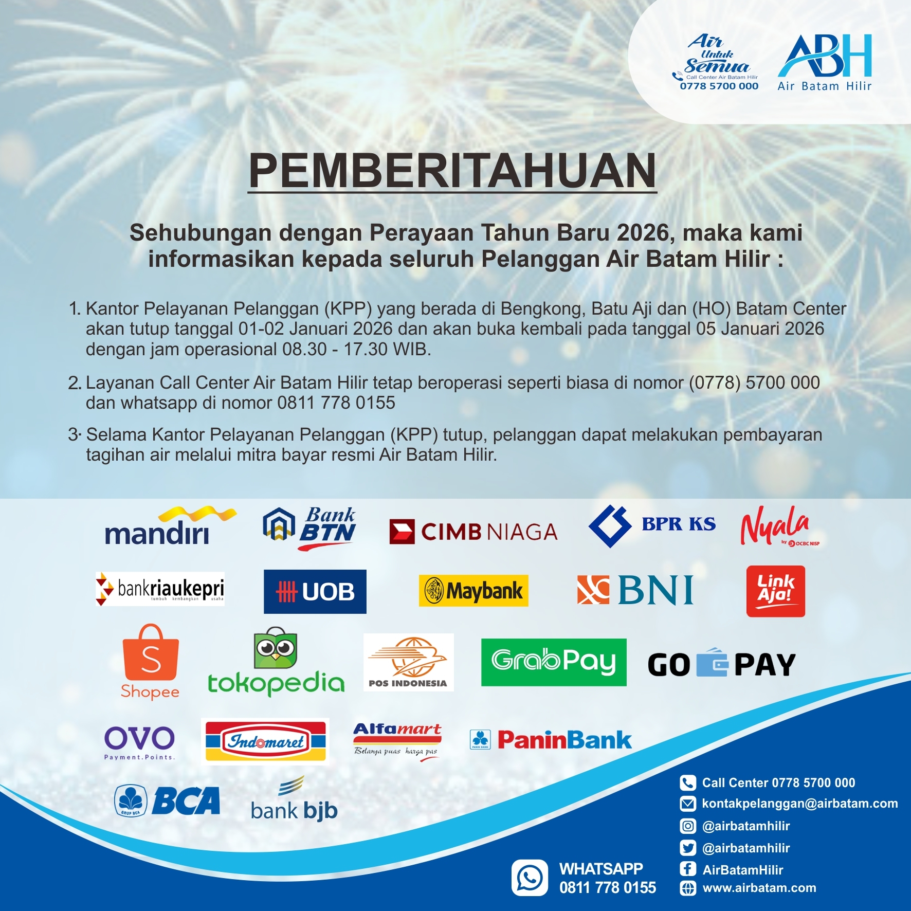 Pelanggan Air Batam Hilir, Sehubungan dengan Perayaan Tahun Baru 2026, Maka kami informasikan kepada seluruh pelanggan Air Batam Hilir : Kantor Pelayanan Pelanggan (KPP) yang berada di Bengkong, Batu Aji dan (HO) Batam Center akan tutup tanggal 01-02 Januari 2026 dan aka