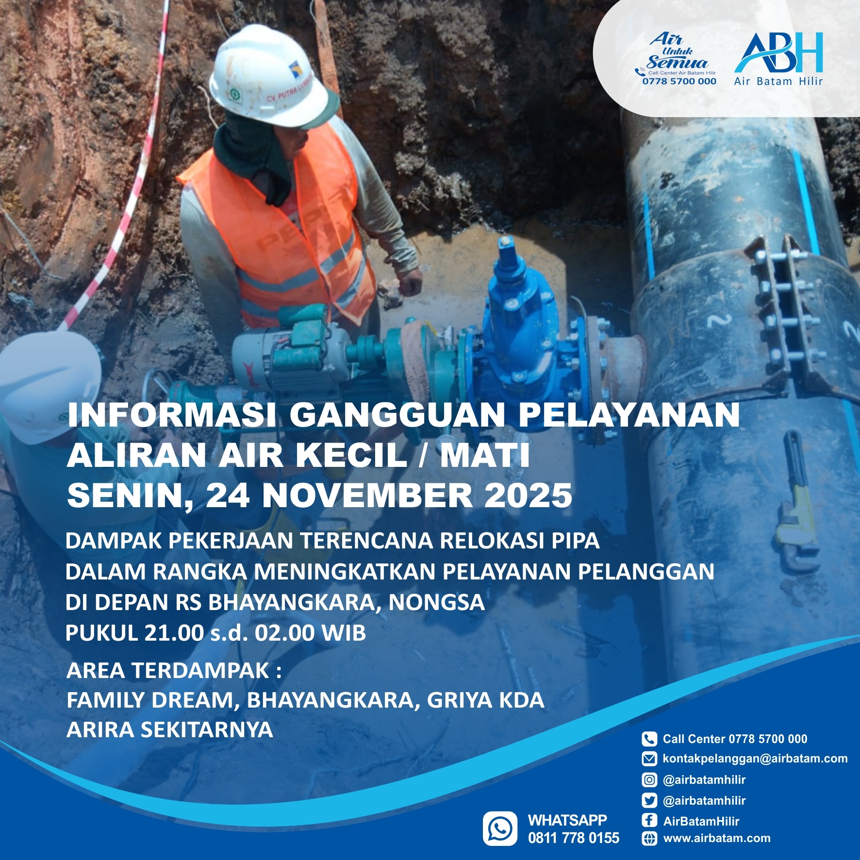 Pelanggan Air Batam Hilir, Air Batam Hilir menginformasikan, pelaksanaan pekerjaan terencana Relokasi Pipa DCIP 300mm di depan Rumah Sakit Bhayangkara, Nongsa dan akan dilakukan pada : Senin, 24 November 2025 Pukul, 21.00 s.d. 02.00 WIB Selama pekerjaan ini, akan berdampak pada gangguan pelayanan