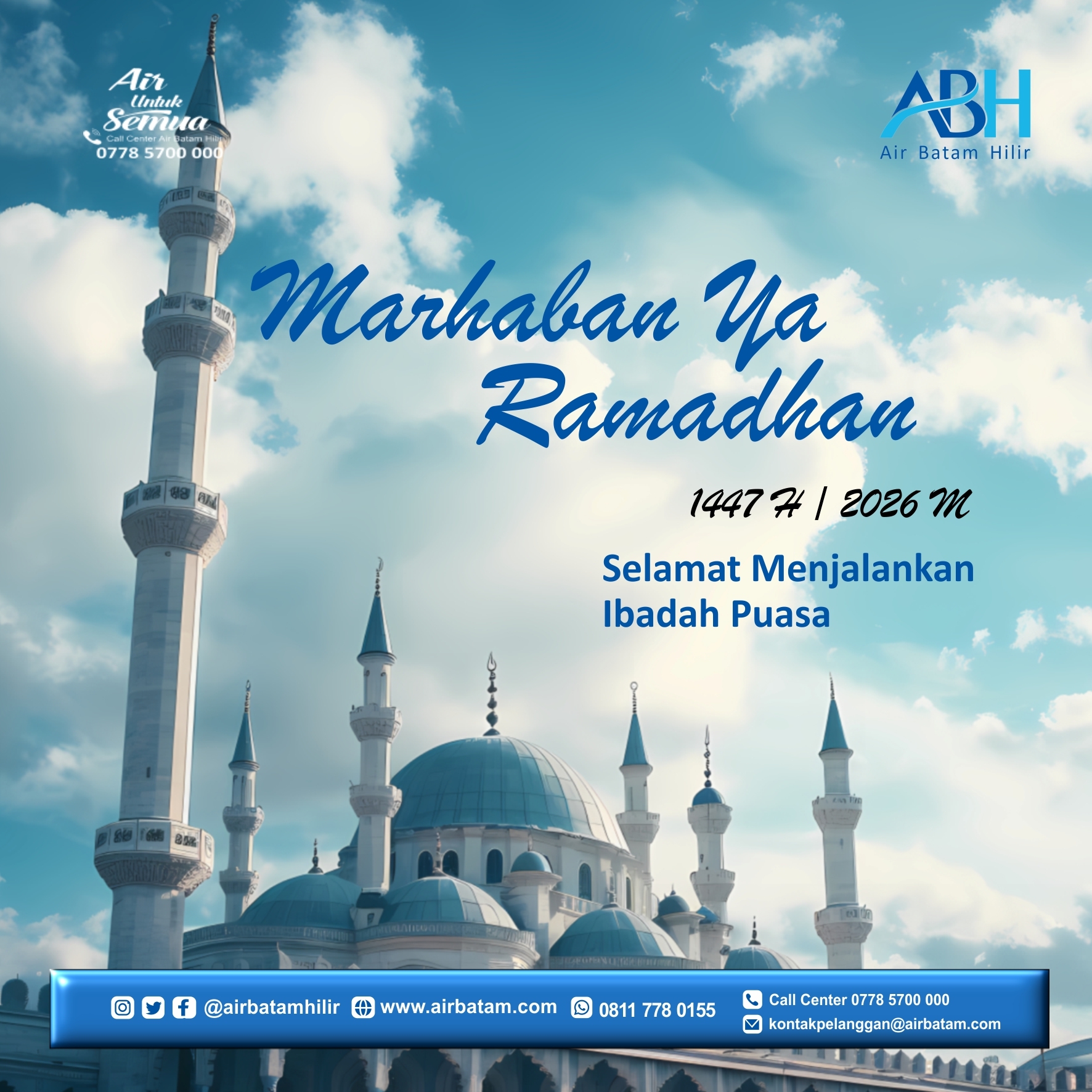 Pelanggan Air Batam Hilir, Direksi & Manajemen Air Batam Hilir mengucapkan : Marhaban Ya Ramadhan Selamat Menjalankan Ibadah Puasa 1 Ramadhan 1447 Hijriah/19 Februari 2026 Pucuk selasih bertunas menjulang Dahannya patah tolong betulkan Puasa Ramadan kembali menjelang Salah dan khilaf mohon di