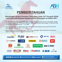 Pelanggan Air Batam Hilir, Direksi & Manajemen Air Batam Hilir mengucapkan : Selamat Merayakan Tahun Baru IMLEK 2026 (2577 Kongzili) - 17 Februari 2026 Semoga di Tahun Kuda Api ini, kesehatan, kemakmuran dan kebahagiaan menyertai kita semua. Sehingga Bangsa In