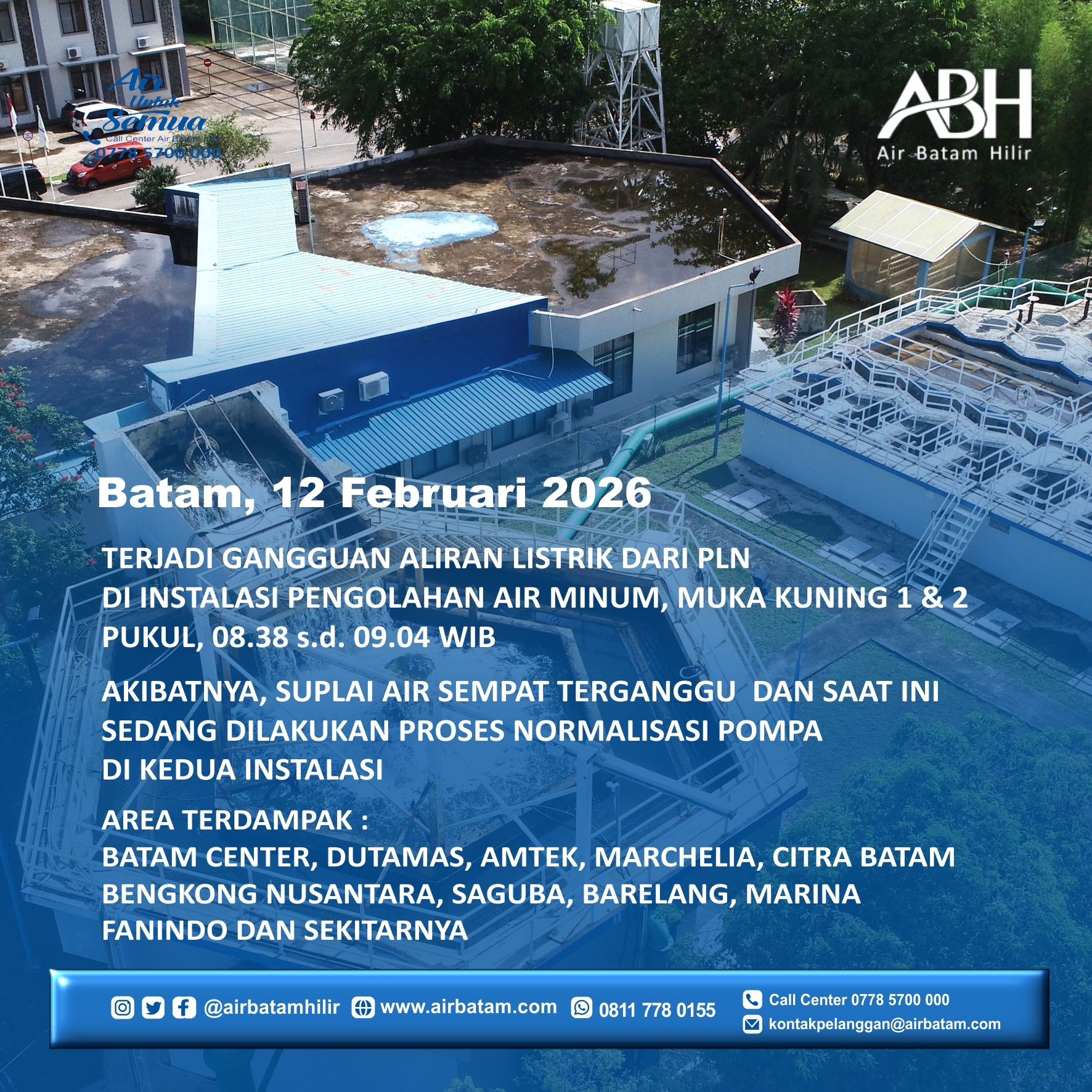 Air Batam Hilir menginformasikan, dampak gangguan aliran listrik dari PLN di Instalasi Pengolahan Air Minum Muka Kuning 1 & 2
