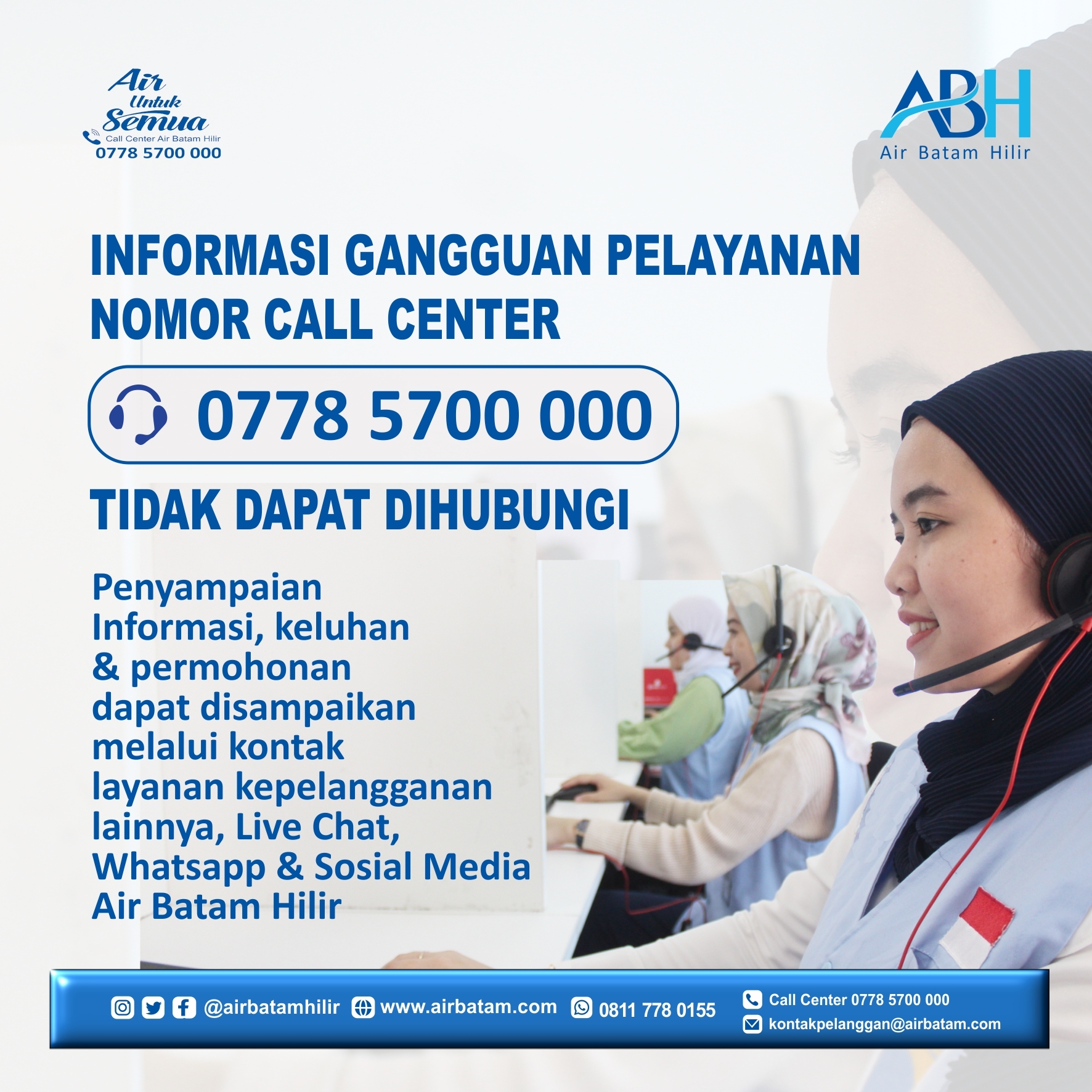Air Batam Hilir menginformasikan, dampak gangguan pelayanan telekomunikasi, saat ini nomor call center 0778 5700 000 tidak dapat dihubungi.