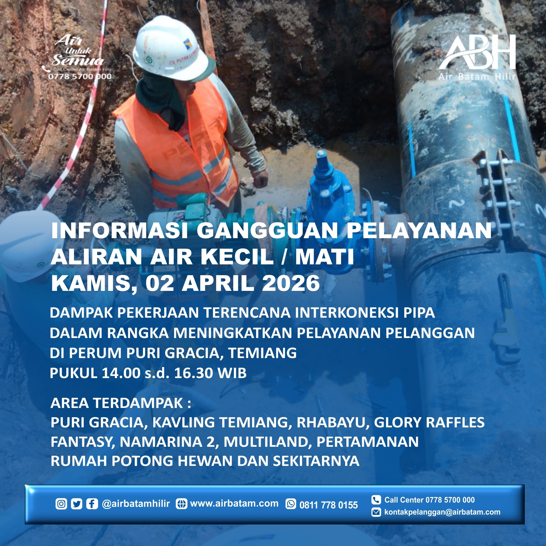 Air Batam Hilir menginformasikan, pelaksanaan pekerjaan terencana Interkoneksi Pipa 160mm di Perum Puri Gracia, Sei Temiang dan akan dilakukan pada :