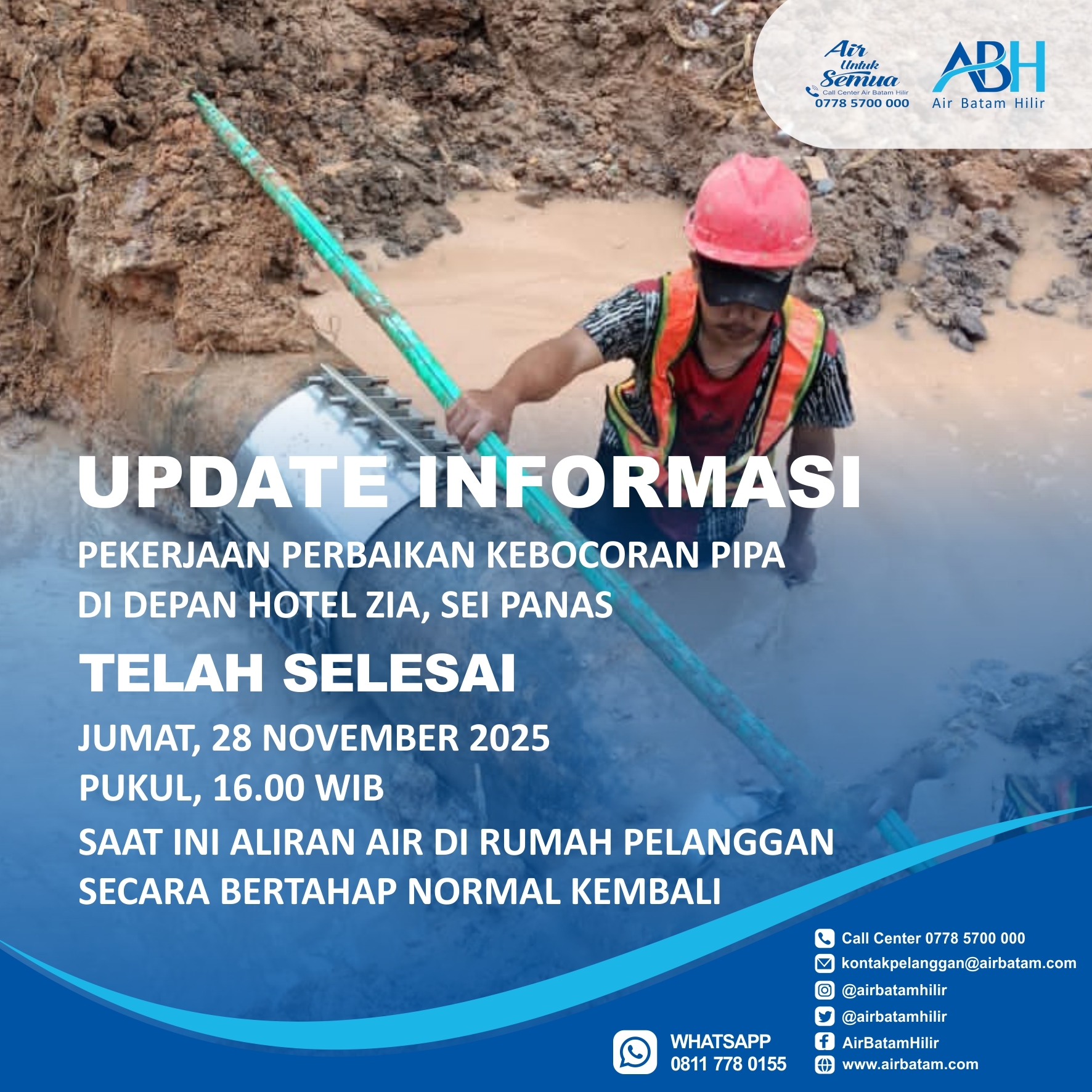 Air Batam Hilir menginformasikan bahwa pekerjaan perbaikan kebocoran pipa DCIP DN 200mm di Depan Hotel Zia, Sei Panas telah selesai.