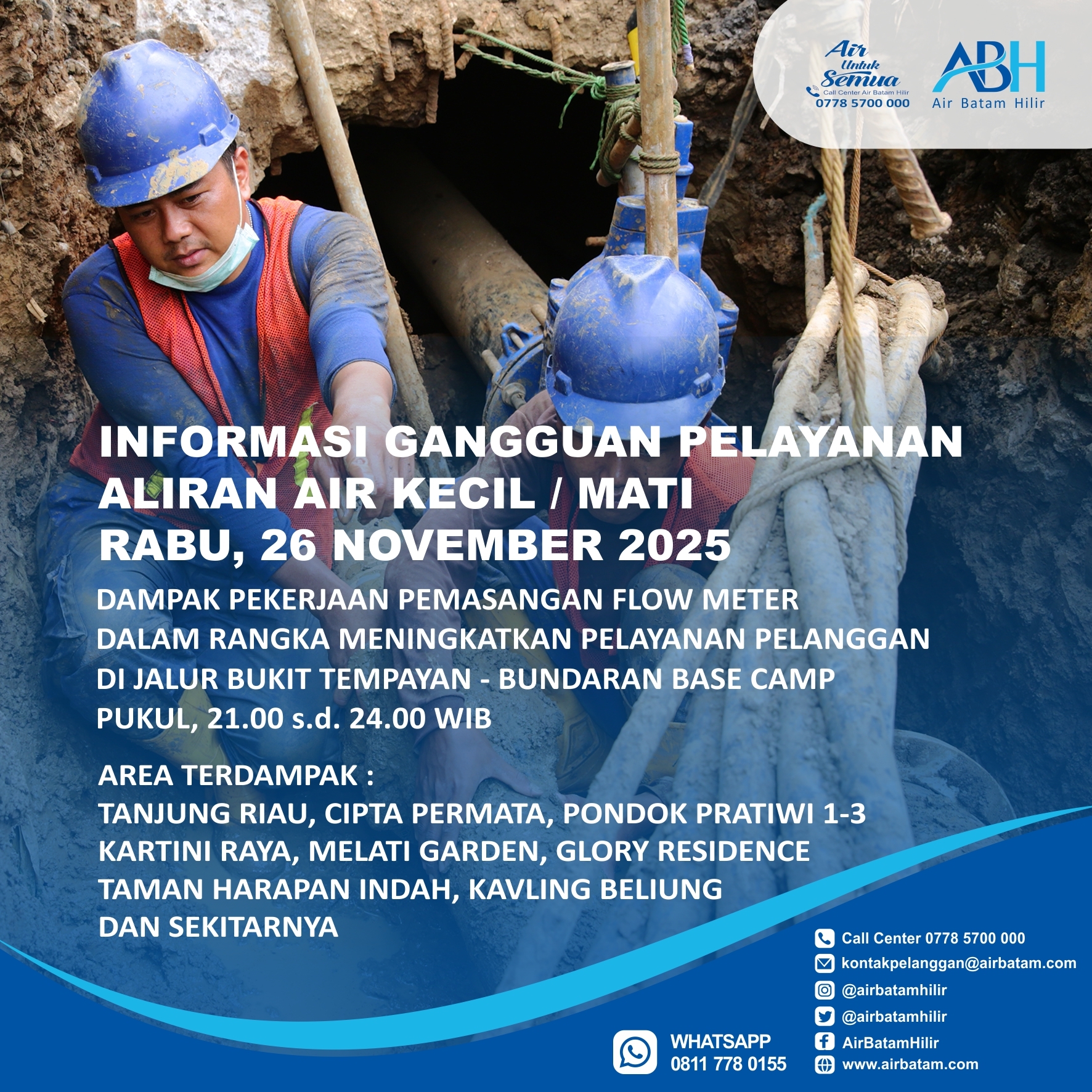 Air Batam Hilir menginformasikan, pelaksanaan pekerjaan terencana Pemasangan Flow Meter DN 300mm di Jalur Bukit Tempayan – Bundaran Base Camp, Batu Aji dan akan dilakukan pada :