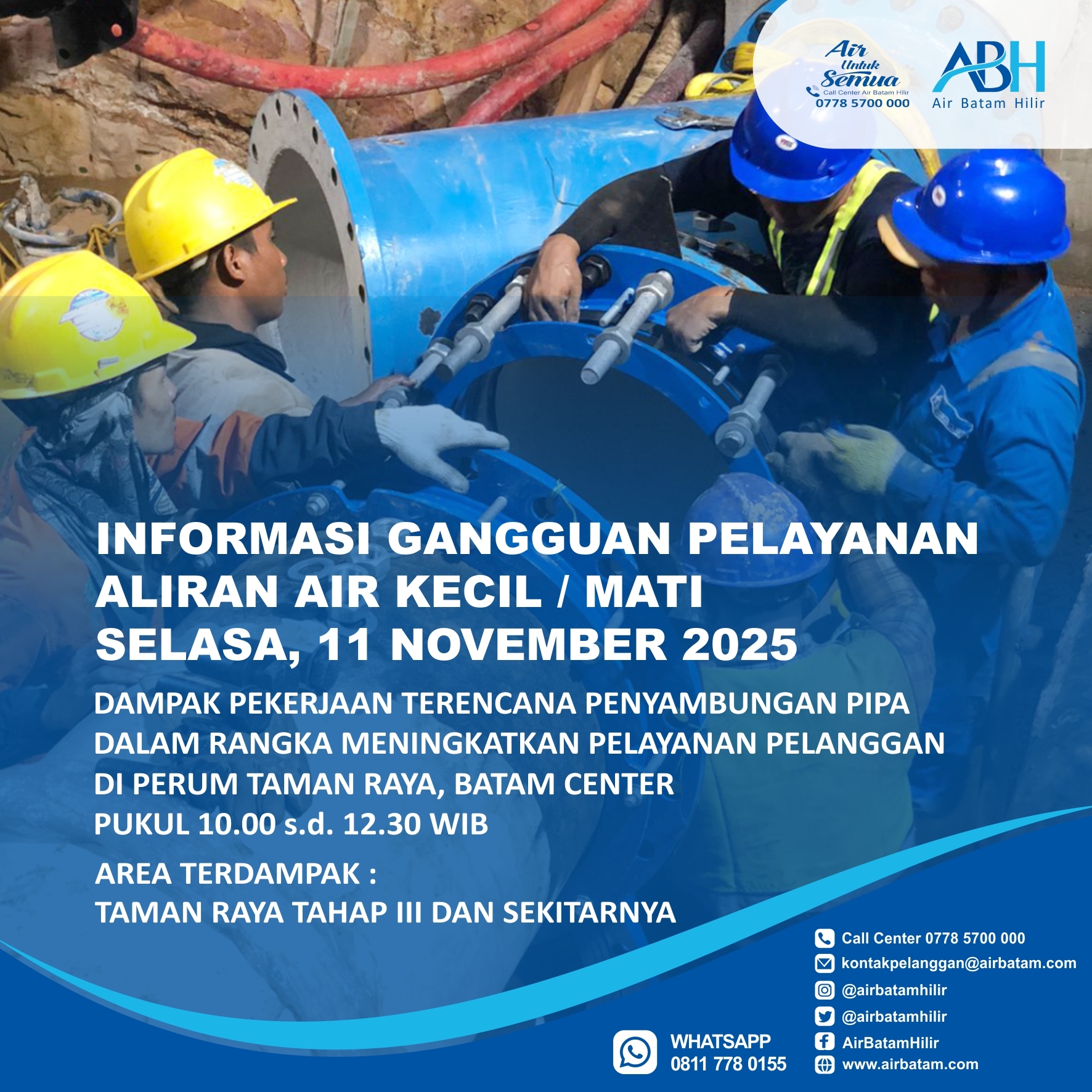 Air Batam Hilir menginformasikan, pelaksanaan pekerjaan terencana Penyambungan Pipa 160mm dalam rangka meningkatkan pelayanan pelanggan di Perumahan Taman Raya, Batam Center dan akan dilakukan pada :