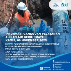 Kami menghimbau kepada pelanggan untuk dapat menampung air agar kebutuhan sehari – hari dapat tetap dilakukan saat pekerjaan berlangsung.