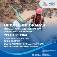 Air Batam Hilir menginformasikan, pelaksanaan pekerjaan Perbaikan Kebocoran Pipa HDPE 160m di Depan Perumahan Symphoni Land, Nongsa dan akan dilakukan pada :