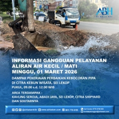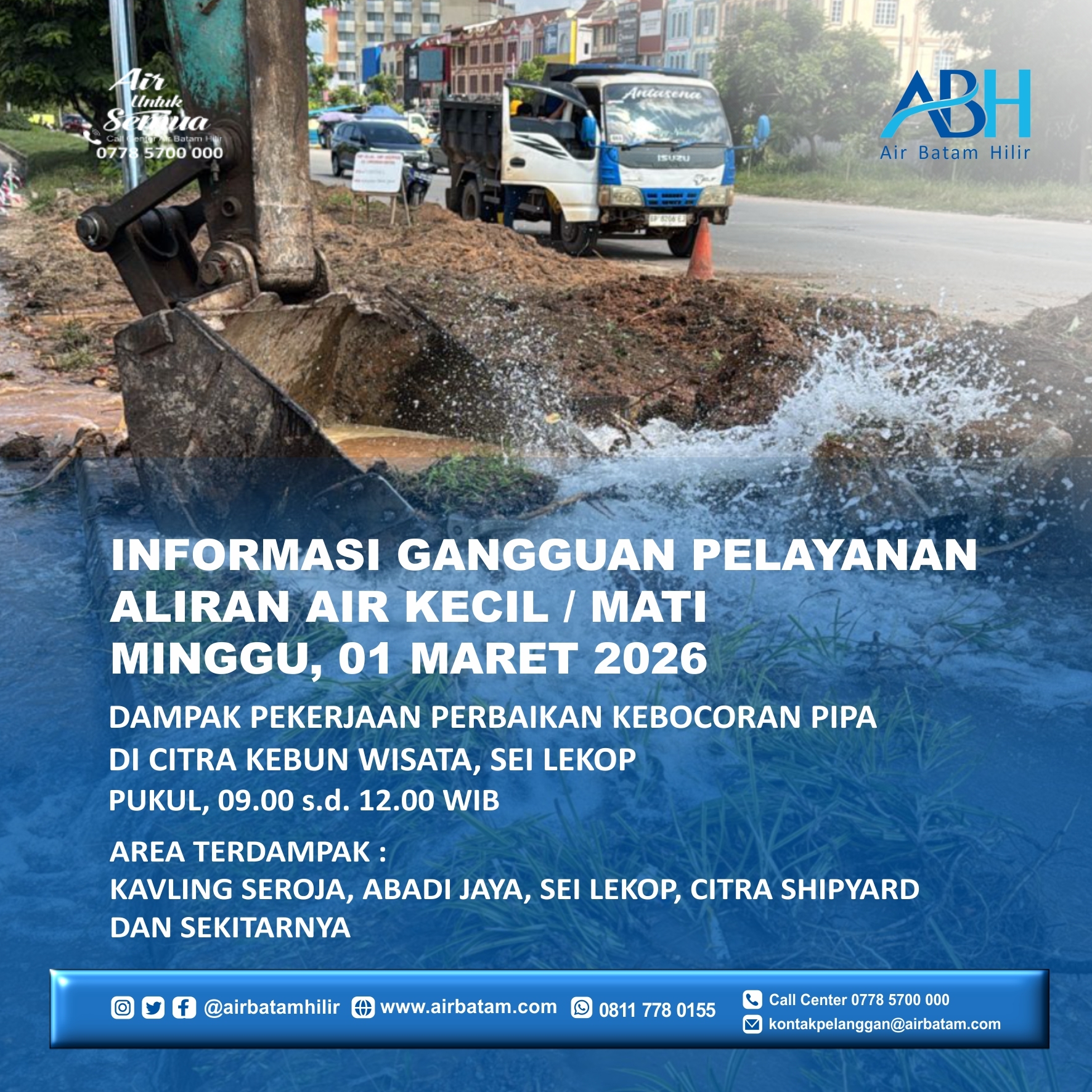 Air Batam Hilir menginformasikan, dampak pekerjaan perbaikan kebocoran pipa HDPE DN 110mm di Depan Citra Kebun Wisata, Sei Lekop yang rencananya akan dilakukan Pada :
