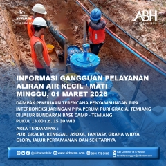 Selama pekerjaan ini, akan berdampak pada gangguan pelayanan suplai air minum berupa air kecil dan air terhenti untuk sementara waktu.
