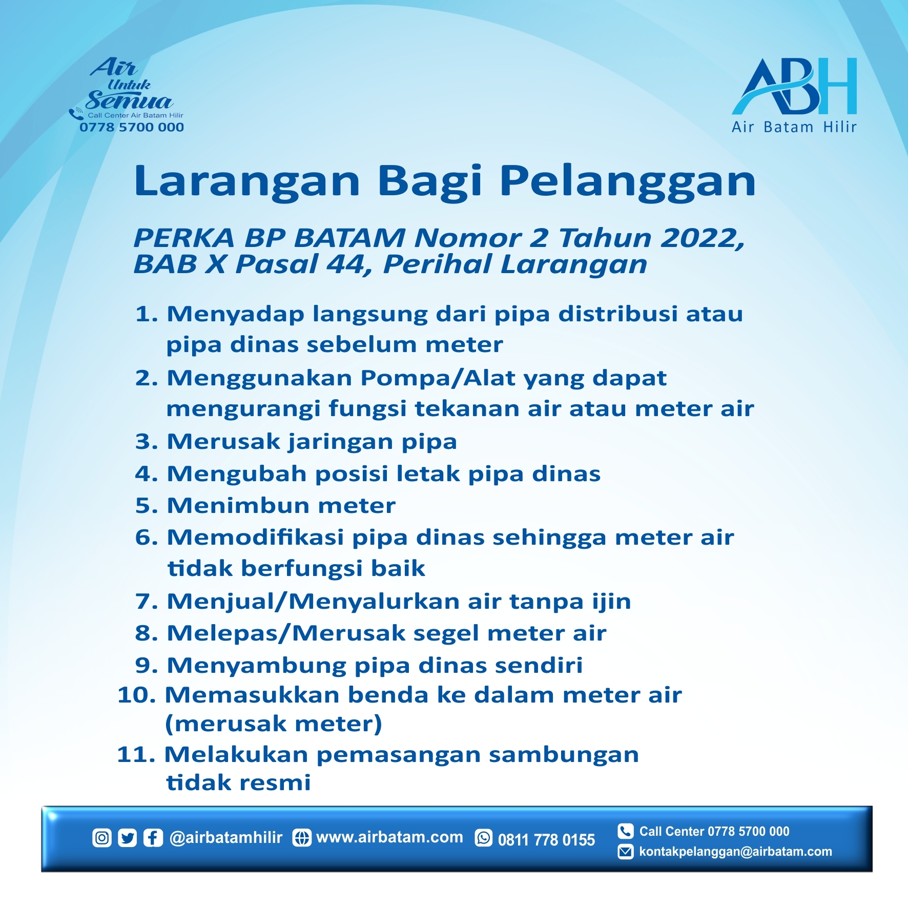 Untuk itu kami menghimbau kepada pelanggan dan masyarakat Kota Batam untuk melaporkan jika menemukan adanya sambungan air ilegal ataupun pemakaian air ilegal melalui Call Center 0778 5700 000, kantor pelayanan pelanggan dan Nomor 0821 7138 5288 dan data pelapor akan di rahasiakan