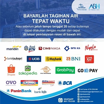 Untuk itu, agar pelanggan tetap dapat mengakses air, maka segeralah melakukan pembayaran tagihan airnya pada berbagai saluran mitra bayar resmi Air Batam Hilir yang berlokasi dekat dengan domisili pelanggan.