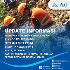 Pelanggan Air Batam Hilir, Air Batam Hilir menginformasikan bahwa pekerjaan perbaikan kebocoran pipa Jalur Buana Vista - Bandara, telah selesai dilakukan. Senin, 22 September 2025 Pukul, 14.30 WIB Proses normalisasi suplai air minum pelanggan membutuhkan waktu beberapa saat dan secara bert